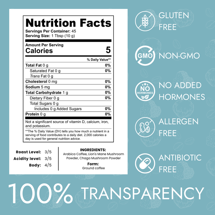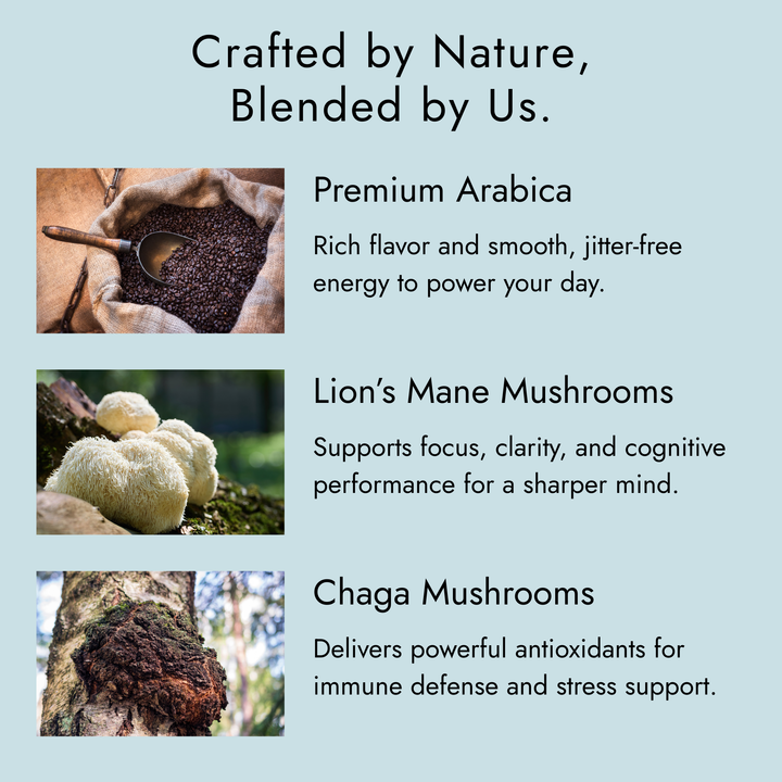 Premium Arabica coffee blended with Lion’s Mane & Chaga mushrooms—crafted to sharpen focus, deepen mindfulness, and sustain creative energy in every sip.